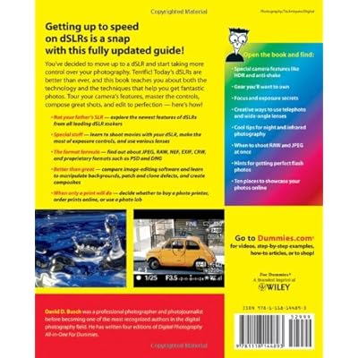 From the Back Cover Getting up to speed on dSLRs is a snap with this fully updated guide! You've decided to move up to a dSLR and start taking more control over your photography. Terrific! Today's dSLRs are better than ever, and this book teaches you about both the technology and the techniques that help you get fantastic photos. Tour your camera's features, master the controls, compose great shots, and edit to perfection — here's how! Not your father's SLR — explore the newest features of dSLRs from all leading dSLR makers Special stuff — learn to shoot movies with your dSLR, make the most of exposure controls, and use various lenses The format formula — find out about JPEG, RAW, NEF, EXIF, CRW, and proprietary formats such as PSD and DNG Better than great — compare image-editing software and learn to manipulate backgrounds, patch and clone defects, and create composites When only a print will do — decide whether to buy a photo printer, order prints online, or use a photo lab Open the book and find: Special camera features like HDR and anti-shake Gear you'll want to own Focus and exposure secrets Creative ways to use telephoto and wide-angle lenses Cool tips for night and infrared photography When to shoot RAW and JPEG at once Hints for getting perfect flash photos Ten places to showcase your photos online Learn to: Take control of your camera's exposure settings for better pictures Choose the right lens for your photo shoot Edit photos to remove mistakes and enhance color IN FULL COLOR! Read more About the Author David D. Busch was a professional photographer and photojournalist before becoming one of the most recognized authors in the digital photography field. He has written four editions of Digital Photography All-in-One For Dummies. Read more